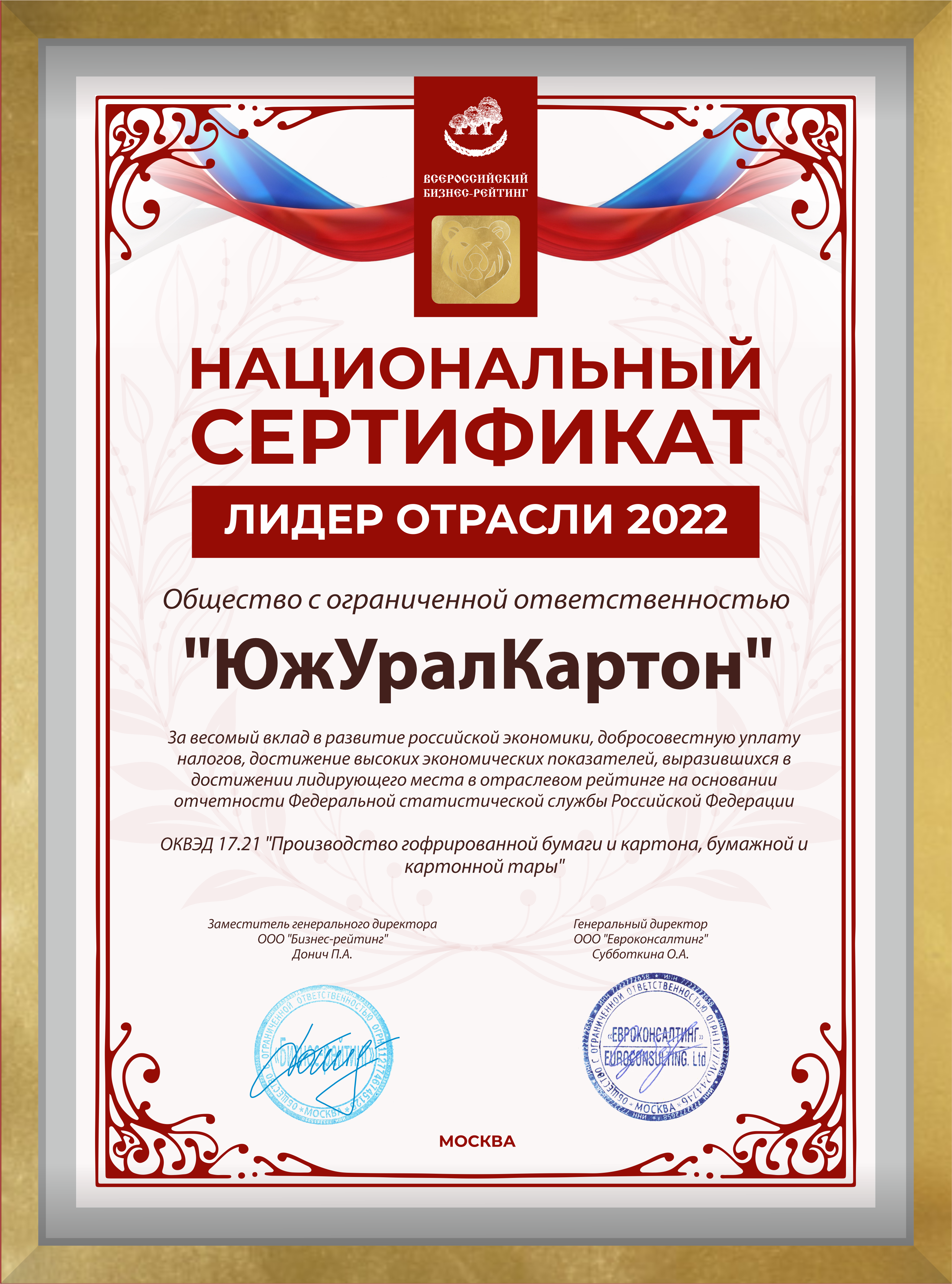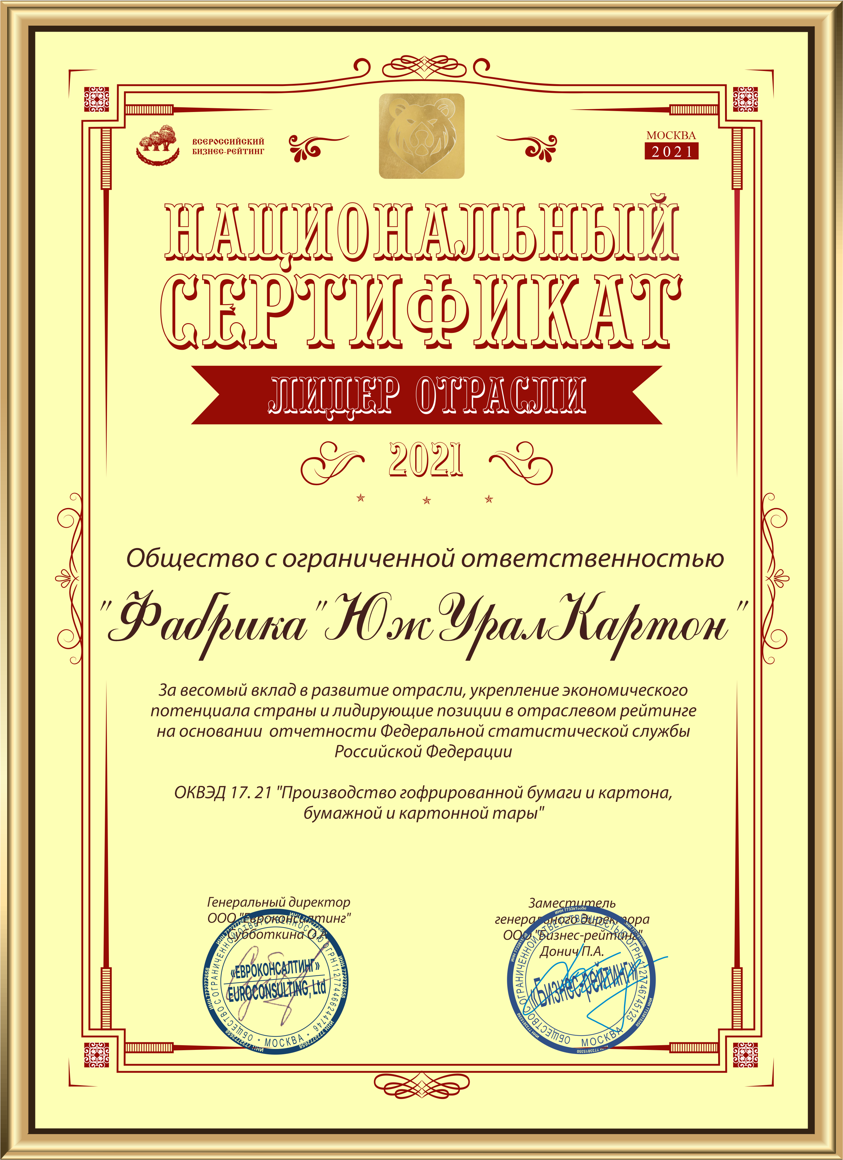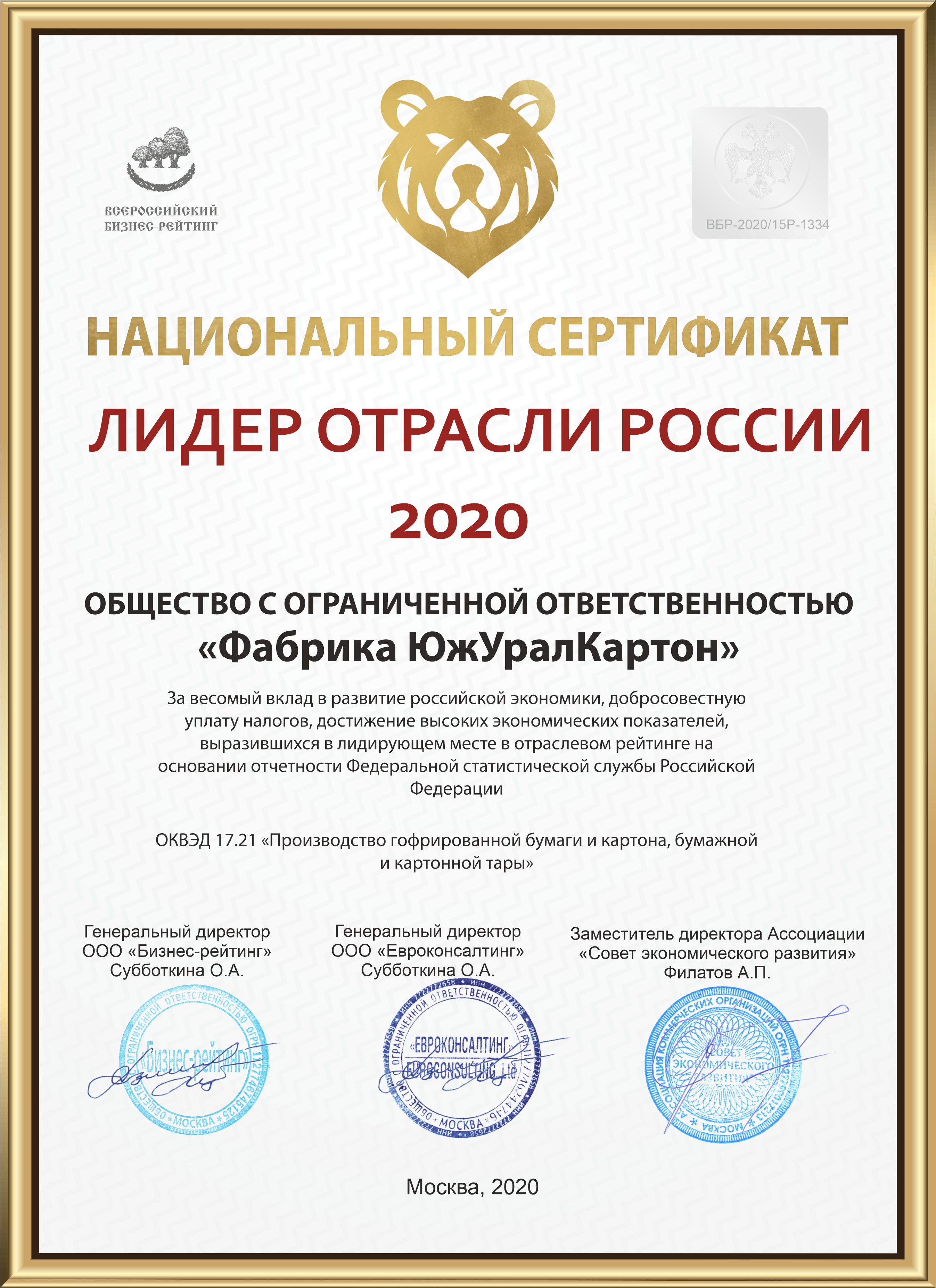 National certificate "Industry Leader of Russia 2020"